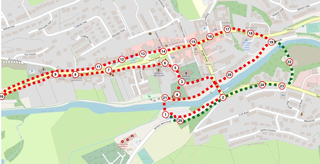 Just up from the Haugh in the direction of the cemetery is the Rothbury Hospital. Its garish lights have been toned down a little but the building with its flat roof, wooden slats and coloured walls looks completely out of place with its surroundings. How it ever got planning permission in a conservation area remains a mystery.