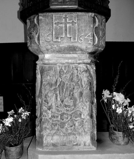 One of the greatest treasures in the church is the pedestal of the font. Although the font bowl is dated 1664, replacing the one damaged in the Civil War the pedestal is Anglo-Saxon. Remnants of the old Anglo Saxon cross were found during the 1850 restoration and are now housed in the Museum of Antiquities in Newcastle. Explanatory pictures are displayed in the Baptistry. The carving of the ascension is quoted as the earliest depiction of this subject in England.