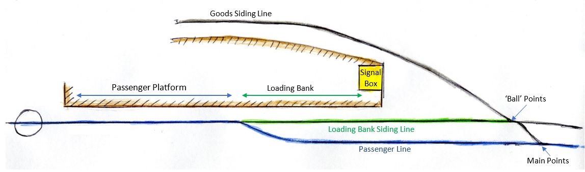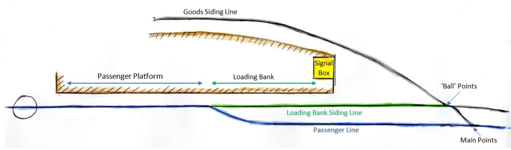 The station at Rothbury has a passenger platform and a loading bank for freight and cattle. Scheduled trains were short enough to run along the passenger line and use just the passenger platform. Excursion trains were usually longer and were brought along the loading bank side line to allow passengers to disembark on the loading bank. (This excursion train had nine carriages and could have used just the passenger platform!). However, it was designated an excursion train and crossed from the passenger line to the loading bank siding. The first, Main points, were operated from the signal cabin. The second, ‘ball points’, must be manually changed and held in place. They had been changed but were not held in place.