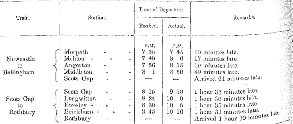 The Newcastle train, consisting of 15 coaches, took 1hour 20 minutes to run the eleven miles from Morpeth to Scots Gap. The delay was due to the train being unable to start on the rising gradient at Middleton station and then sticking fast on another rising gradient outside Scots Gap station. The engine which had brought the empty branch train from Rothbury had to go and help the Newcastle train at Scots Gap and later to assist it again on its departure from Bellingham. So, it was 9:50pm, 1 hour 35 minutes late, that the Rothbury passengers could resume their journey home.