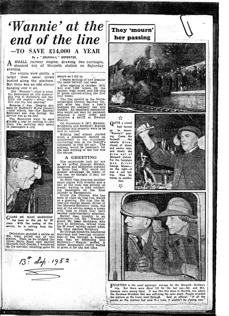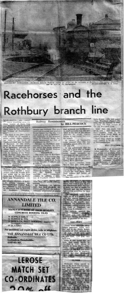 As people abandoned the train in favour of the car the line became hopelessly uneconomic. The passenger service was finally withdrawn with the last train running on the 13th of September 1952. The branch remained open for freight with occasional passenger excursions. The final steam hauled enthusiasts to Rothbury on 9th November 1963 and the freight service was withdrawn two days later. The very last passenger train was a private diesel working in July 1964 carrying members of the North Eastern Region’s Chief Civil Engineering staff on their annual office outing. The track was lifted later that year.